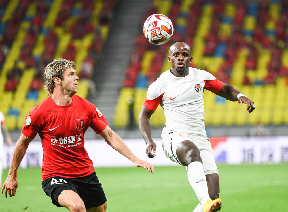5月6日,成都蓉城队球员艾克森(右一)在比赛中射门。