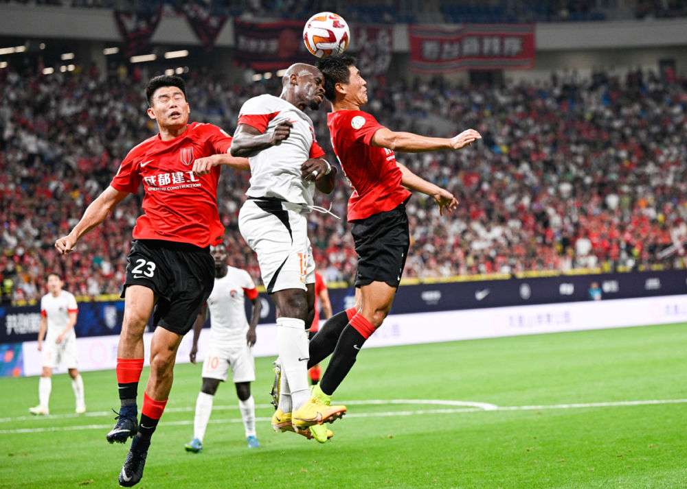 5月6日,成都蓉城队球员艾克森(中上)在比赛中头球攻门。