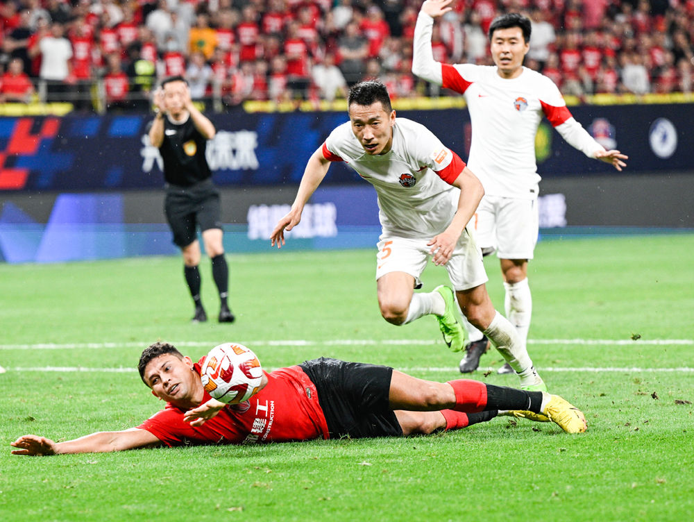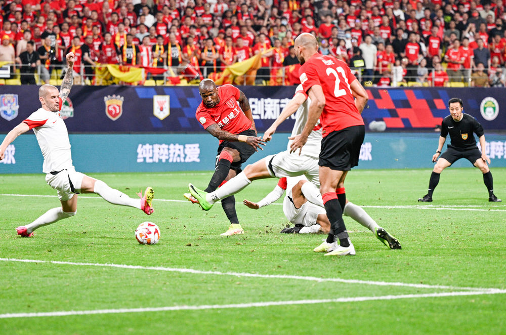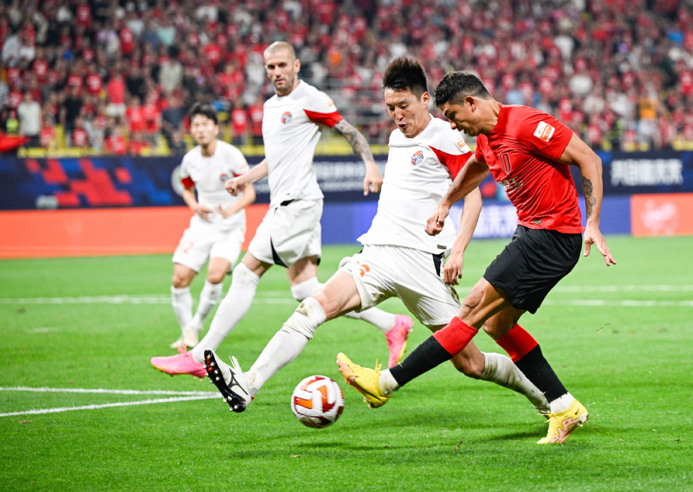 5月6日,成都蓉城队球员帕拉西奥斯(左二)在比赛中射门。