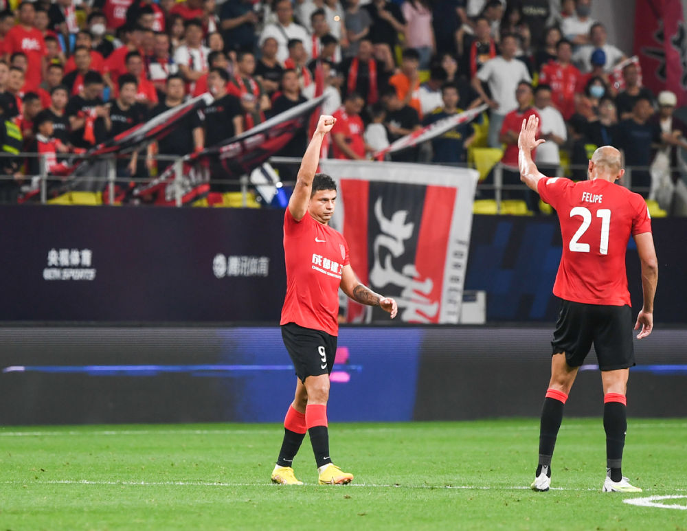 5月6日,成都蓉城队球员费利佩(右二)在比赛中庆祝进球。