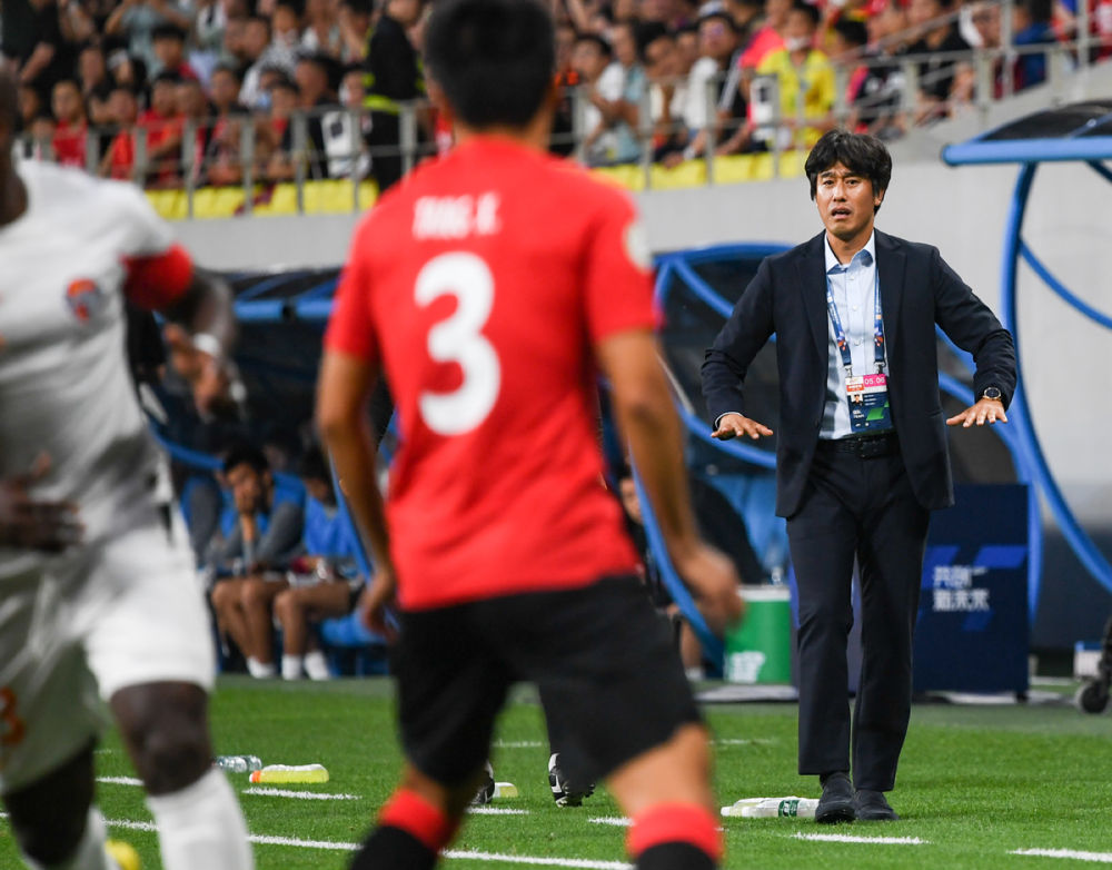 5月6日,成都蓉城队主教练徐正源(右)在比赛中指挥。