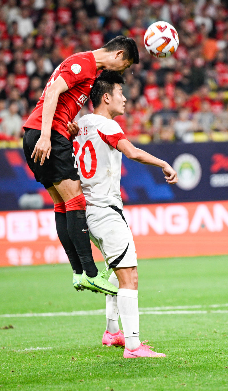 5月6日,成都蓉城队球员杨一鸣(左)和青岛海牛队球员钟晋宝在比赛中争顶。