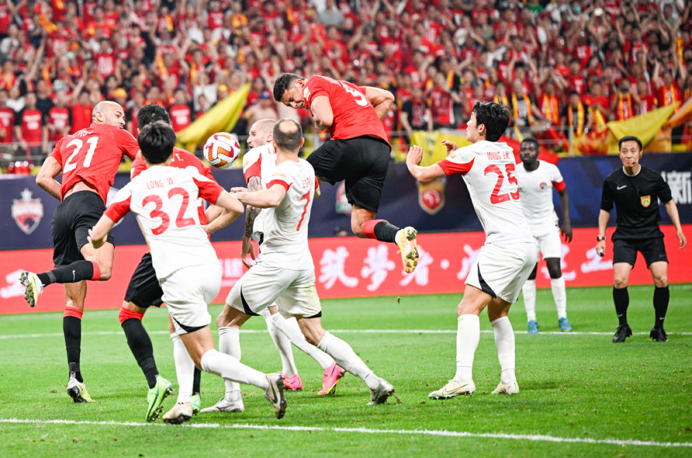 5月6日,青岛海牛队球员塔贝克(中)在比赛中争顶。
